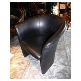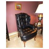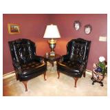 - Pair vintage tufted black leather wingback chairs w/ nailhead detail