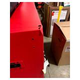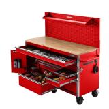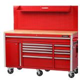 The Husky 61 in. W 23 in. D 10-Drawer 1-Door Mobile Work Center with Solid Wood Top and Flip-Up Pegboard is a great addition to any work space and is now available in red finish. This all-welded steel work bench has a flip-up pegboard that can hold up to 200 lbs. and will create additional storage solutions and quick access to your most frequently used tools. There is also an adjustable 48 in. shelf that can be mounted to the pegboard in 3 different positions based on your need.