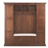 All-in-one unit comprised of a storage bench, a hall tree, cubby storage and 2 cabinets Storage bench features 2-drawers and 2-doors Fabric seat cushion with foam fill Hall tree features 4 double hooks 3 open cubbies Each cabinet features 2-doors: a top door with 1 adjustable shelf and a taller lower door with 3 adjustable shelves Metal door and drawer pulls in zinc finish 81.5 in. H x 79.25 in. W x 17 in. D Cubbies: each is 12 in. H x 13 in. W x 10.5 in. D Seat cushion: 2 in. H x 41.5 in. W x 14.25 in. D Assembly required