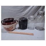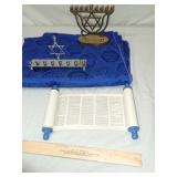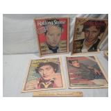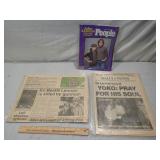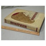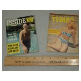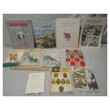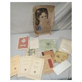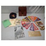 Description: Antique School cap - Collegiate pennant stickers - Vtg books - PAULS COLONIAL CRAFTS Wood Magazine box.