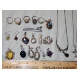 Description: Sterling Silver Jewelry. Every piece is marked .925. Rings - Necklace Pendants - Tie pin - Earrings - Necklaces - Unknown Stones. 126.55g.