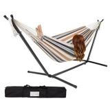 Woven Cotton Rope Double Hammock for Porch, Backyard w/ Spreader Bars, Carrying Case - - Lay down, take in the outdoors, and relax in total comfort. This double hammock can transform any outdoor space into an oasis of serenity. After a strenuous day at work, hop into the woven cotton and let the gentle sway of the hammock reduce stress, improve focus, and help to relieve muscle aches. Pack it up in its convenient carrying case and bring relaxation and leisure wherever you go. FEATURES: Ample room for up to 2 adults in the spacious cotton bed Elevate body and lay flat to help relieve stress and provide blood circulation to the head 900 feet of twisted cotton, hardwood spreaders, and metal rings create durability Carrying case with handle make it simple to transport the hammock. IN FACTORY PACKAGING. RETAIL: $ 101.99 |