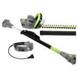 Earthwise CVPH43018 Corded 4.5 Amp 2-in-1 Convertible Pole Hedge Trimmer. The Earthwise CVPH43018 is the safe, simple and easy to clip those tall hedges, and shear shrubs and bushes that are just out of reach. The pole attachment is equipped with a pivoting head with 5 settings for precise trimming. No need for a dangerous ladder, this pole hedge trimmer measures at a max length of 8 feet 8 inches from the handle to the end of the blade! Easily change from a pole hedge trimmer to a handheld hedge trimmer within seconds. The Earthwise CVPH43018 2 in 1 hedge trimmer is the answer for all your trimming needs. NEW in Retail Packaging. Please Preview. Retail $77.76