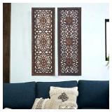 Deco 34087 Elegant Sculpture 2 Assorted Wood Wall Panel. Handcrafted in India from natural mango wood and MDF, this set of ornately-carved wood wall decor has 2 tall wood panels, each with a hand-carved decorative frame, large flowers, leaves, and acanthus designs from top to bottom. NEW in Retail Packaging. Please Preview. Retail $70.78
