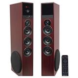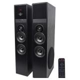 Rockville TM80B Black Home Theater System Tower Speakers 8" Sub/Bluetooth/USB Rockville TM80B Complete Powered Home Theater Tower Speaker System With Dual 8" Subs.Built In Bluetooth with 150 foot range and perfect interference-free sound quality.Built in USB playback.Built in SD card playback. 2)8" subwoofers with incredibly loud and deep bass response.4)Full range drivers: 4" full range drivers with polypropylene cones, rubber surrounds, and bullet dust cap to give you incredible loud and clear sound.2)silk dome tweeters for incredible highs! Peak Power: 800 Watts. RMS Power: 200 Watts. Built in 8 band equalizer with preset equalizer curves. Adjustable bass and treble. Built in high and low pass crossovers professionally tuned by audio engineers for top performance. Built in FM radio with crystal clear reception. Cabinet material: Top quality MDF (0.472" inch thick high-grade MDF). (2) pairs of RCA inputs. (1) 3.5MM aux input. (1) Optical input. Front panel USB and SD inputs. (2) ¼" Mic inputs for karaoke. (2) RCA outputs make the system expandable. Digital display on front panel with brightness control. Incredible design with silver plates surrounding each speaker and modern furniture style look. We also made all the edges and corners rounded. Built in class A/B amplifier with audiophile grade sound quality. Our built in amplifier features a quad amp design: Each driver features frequency specific independent amplifiers. The amplifier internal circuitry is the ST model # TDA7265. We use a "6Sigma" style Quality Assurance of Each Product. Includes a noise rejection cable to connect the 2 speakers together. We also use a special cable tip that will not allow the user to plug the cable in backwards. NEW! In original packaging! NO REFUNDS once item has left the pickup location. Retail price $184.95 |