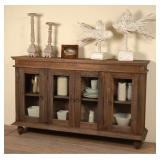 Sunset Trading Shabby Chic Cottage Sideboard, Raftwood ✔ This roomy storage cabinet has four doors with three cabinets Rustic grain in wood makes each piece unique ✔ Constructed from solid Mahogany wood Floor protectors ✔ Attractive antique brass metal hinges and round handles Glass secured with finished solid wood inside doors Stained Mahogany back and interior One stationary shelf in each cabinet ✔ DIMENSIONS: Overall: 35.5”H x 13.75”D x 59”W Top: .75” with 1.5” overhang in front and sides, flush in back End cabinets interiors (2): 28.5”H x 10.5”D x 14.5”W Middle cabinet interior: 28.5”H x 10.5”D x 26.25”W End cabinets opening clearance (2): 25”H x 12”D x 12.5”W Middle cabinet opening clearance (1): 25”H x 12”D x 25”W Doors (4): 25”H x 1”D x 12”W End cabinets top storage (2): 16”H x 10.5”D x 14.5”W, End cabinets bottom storage (2): 11.75”H x 10.5”D x 14.5”W Middle cabinet top storage (1): 16”H x 10.5”D x 26”W Middle cabinet bottom storage (1):11.75”H x 10.5”D x 26”W Bun feet: 4”H x 3” Round Weight: 69 lbs. ✔ Anti-tip kit included for safety and stability Environmentally sustainable seven step finishing process will not harm your children, pets and household Damaged. In opened factory packaging. See at preview. Retail price $632.59 |