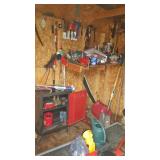 HUGE TOOL SELECTION INCLUDING BAND SAW, GAS GENERATOR, TABLE SAW, TOOL CHESTS, PARTS BINS, LATHE, WORK BENCHES, DRILL PURSES CAN BE CHECKED IN UPON ENTANCE, BENCH GRINDER, DRILLS, POWER SAWS AND HAND TOOLS