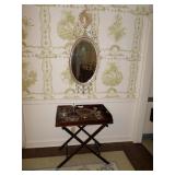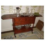 Kittinger Furniture including marble top buffet table, drop leaf foyer table, flip top card table, Williamsburg adaptation tray top table and kettle stand.