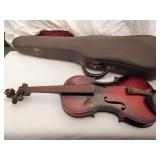 Description: Antique Violin. Unknown maker. Includes antique leather bound hardcase. Beautiful tigerwood finish and hand carved neck. I found no maker mark.