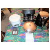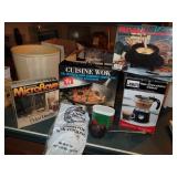 Description: Five new appliances - Micro rave - Cuisine Wok - Rival Electric Fondue Set - Bialetti Hot Chocolate Maker - Wok cooking utensils.