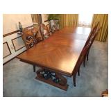 Description: Mid Century UNITED FURNITURE Dining table and chairs. Includes 2 big leafs and 6 chairs.