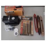 Description: crate filled with items - level - wallpaper brushes - warning lamp - Copper - etc.