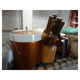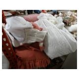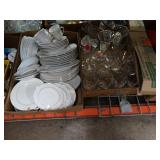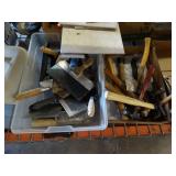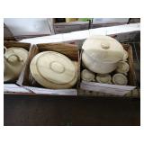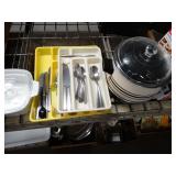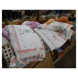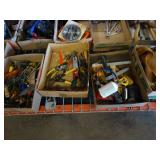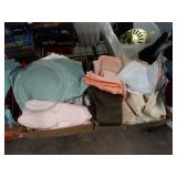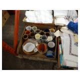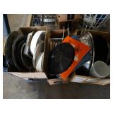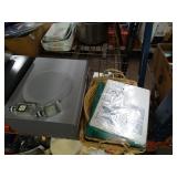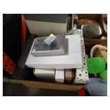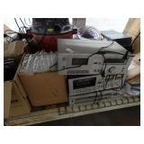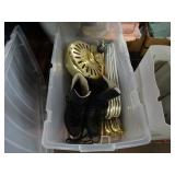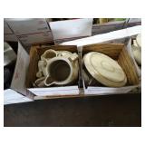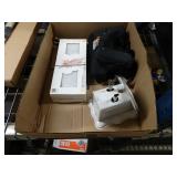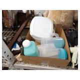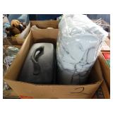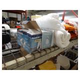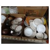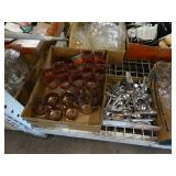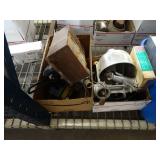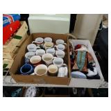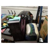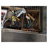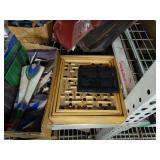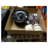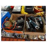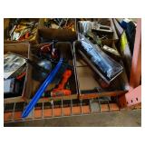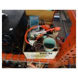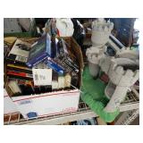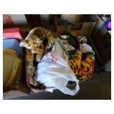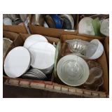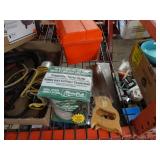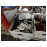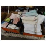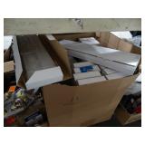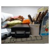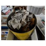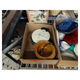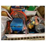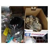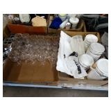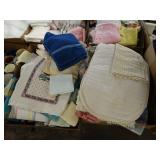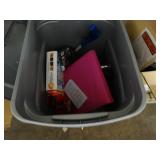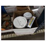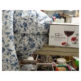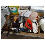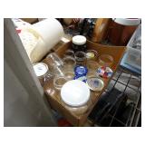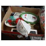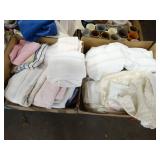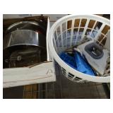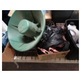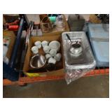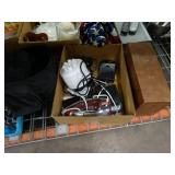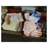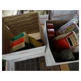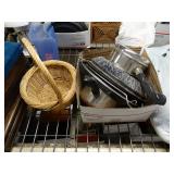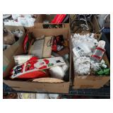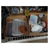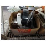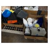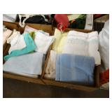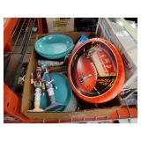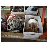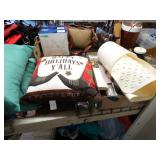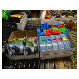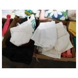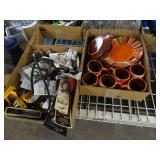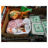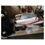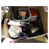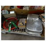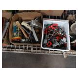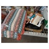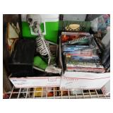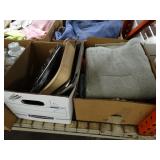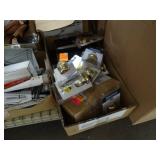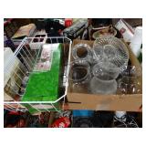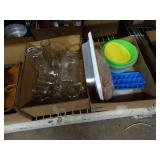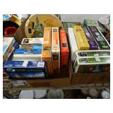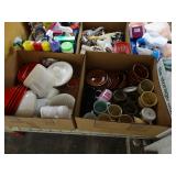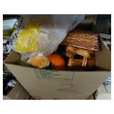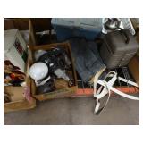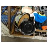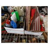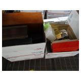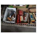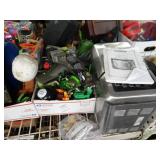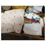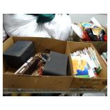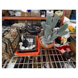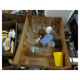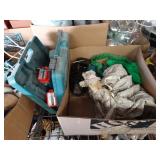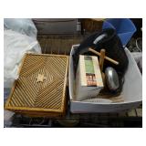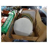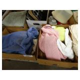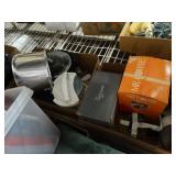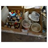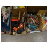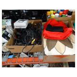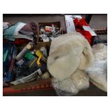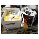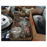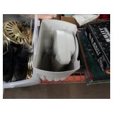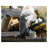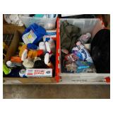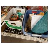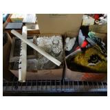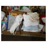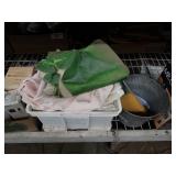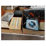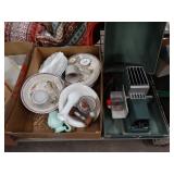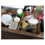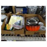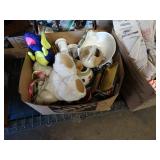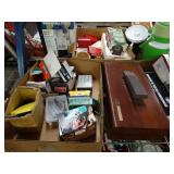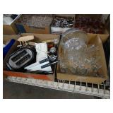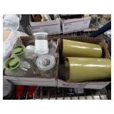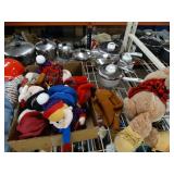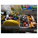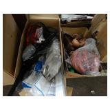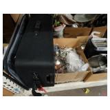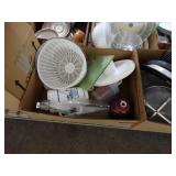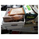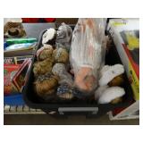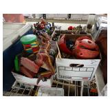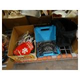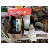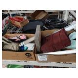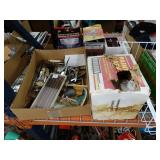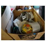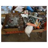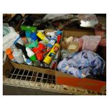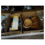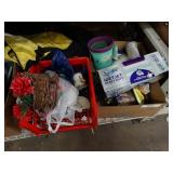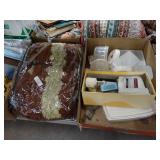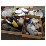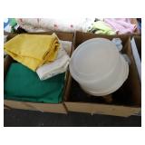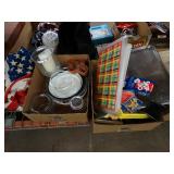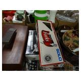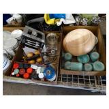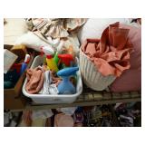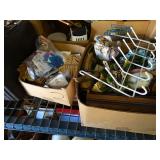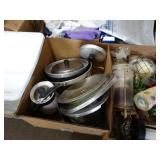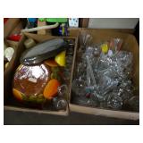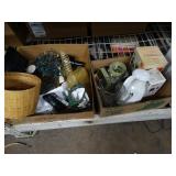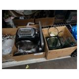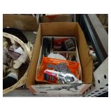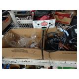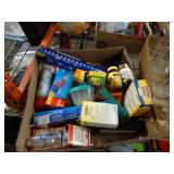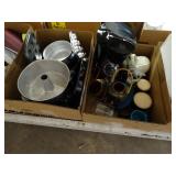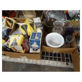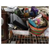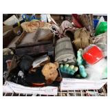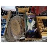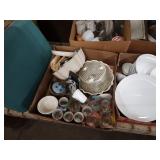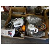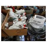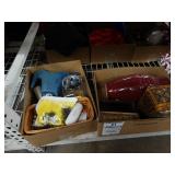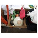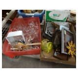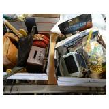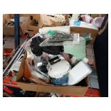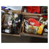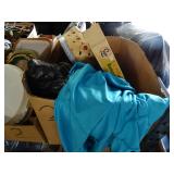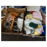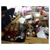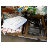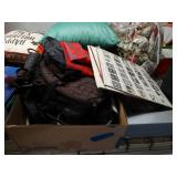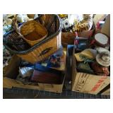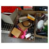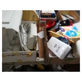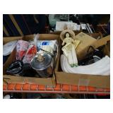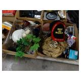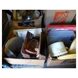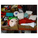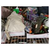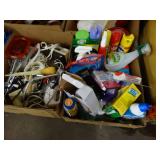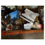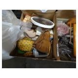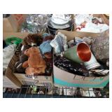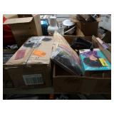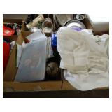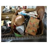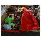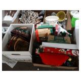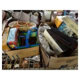 Box lots with kitchen ware, tools, decor, estate sale items, toys, linens