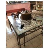 Square glass top coffee table with metal scroll work legs excellent condition
