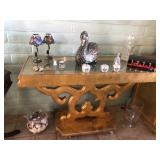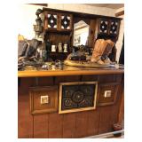 Unique one of a kind custom made bar, has inlaid top covered with glass, foot rail around bottom, several accent pieces, must see to appreciate