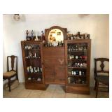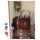 Large Asian style display unit with mirror in center and glass doors, drop down writing shelf, excellent condition