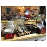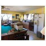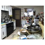 Usual kitchen items, pots, pans, baking dishes, appliances, like new large meat slicer