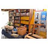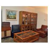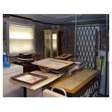 Vintage Wooden Glass-Topped Coffee Table Vintage Marble Topped End Tables Wooden Corner Table Display Cabinets (many of which are lighted) Vintage Dining Table and 4 Chairs Vintage Brown Leather Club Chair Wing Back Chairs Wrought Iron/Glass Coffee Table Coat Rack 2 Vintage Wood Sideboards, One with Sliding Glass Display Case Vintage Twin Hospital Bed TV Stand/Cabinet Many Vintage Wood Bookshelves White Country Style Kitchen Table with Tile Top and 4 Chairs Vintage 6 Drawer Highboy Wood Dresser 2 Vintage Wood Nightstands Vintage 12 Drawer Dresser with Mirror Midcentury 3 Drawer Chest Small White-Painted Side Table Stainless Steel and Glass Shelving Units Twin Bed Frame and Mattress Floor Lamp Vintage Vibrating Club Chair Vintage Metal Desk Vintage Desk Chair Vintage Metal File Cabinets Glass Cubby Shelving Unit Vintage Console Table with Shell Top Round Brass Tray Coffee Table And MORE!
