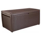 Keter Sumatra 135 gallon Outdoor Storage Rattan Deck Box, Brown. You can store just about anything in it and feel confident that it will stay protected all the while. The box keeps stored items dry, and tiny holes keep them ventilated too. Therefore, you don't have to worry about opening the box to musty odors or other unpleasant surprises. And, with its stylish rattan weave finish, this storage bench fits in nicely with any outdoor theme or patio décor. NEW in Packaging. Please Preview. Retail $124.15 ***Winning Bidders Must Inspect This Item Before Leaving The Building to Qualify for a Refund.*** |
