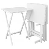Casual Home 5pcs Set-White Tray Table. With this 5-piece folding table set you can have a table anywhere in your home. Made of 100-percent solid wood, this set includes 4 folding tables and a convenient storage stand, which is great for transportation. Perfect for TV meals or family meals that make their way out of the kitchen or dining room. NEW in Packaging. Please Preview. Retail $81.45 ***Winning Bidders Must Inspect This Item Before Leaving The Building to Qualify for a Refund.*** |