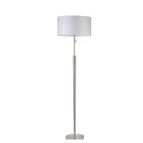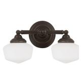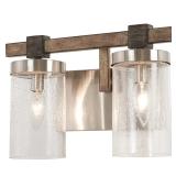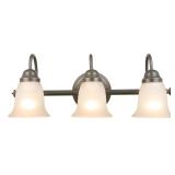 This transitional two-light wall vanity by Commercial Electric offers versatile lighting. It can be installed as an uplight or downlight and uses two 60-Watt incandescent bulbs, which are not included. This sconce boasts a durable steel body with a brushed nickel finish and frosted glass shades that fill the area with warm, soft light.