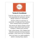 Enter the sale at your own risk! Brie’s is not responsible for accidents, injuries, allergic reactions or sensitivities. All items sold as is and have no warranties. All sales are final. Examine items carefully before purchasing! We reserve the right to charge correct pricing on items which have removed, changed or altered price stickers. Cash, good checks, VISA, MasterCard, Discover Card and American Express accepted. Credit cards over $10 please. Sorry but there is no staff available to assist in moving heavy objects. Please line up in an orderly fashion to start. We do limit the number of customers who can enter the home at one time to start but do our best to expedite this process.