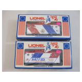 Two Lionel Railroad Club Train Cars including 1990 Searchlight Car 6-16803 and 1984 Covered Hopper 6-0784, O Scale, new in boxes 1lb 7oz
