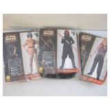 Three Vintage Star Wars Halloween Costumes including Anakin Skywalker (kids small), Darth Maul (kids medium), and Jar Jar Binks (kids medium), all in original packaging 1lb8oz