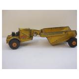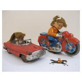 Two Vintage Tin Friction Toys including 1950s Haji Tin Friction Motorcycle with Female Rider and Convertible with female driver (AS IS, see pictures), both made in Japan 1lb