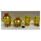 Yellow carnival glass color with lamb handles and accents. Creamer, Spooner, Covered Butter Dish and Covered Sugar Dish. All pieces are marked on the bottom with a B in a diamond. Please ask specific questions on details, condition, and shipping