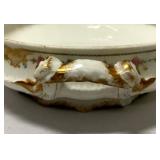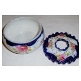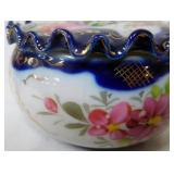 Beautiful pink hand painted florals and gold trim. Top has a ruffled edge. Please ask specific questions on details, condition, and shipping prior to bidding, ALL ITEMS ARE SOLD AS IS, and the bidder will be responsible for payment. We box and ship