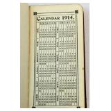 Small pocket calendar with monthly view of 1914 in front and 1915 in back. Also includes maps of the world, US, etc... Information: In case of Poison, Help in case of an accident, Population of the US, Rates of Postage, Distances between US cities, a