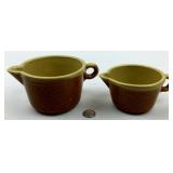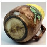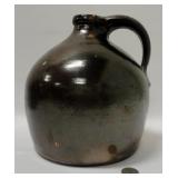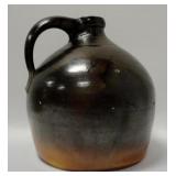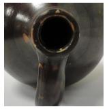 This stoneware jug features a lovely deep brown color and a large handle. It is a beautiful wide round jug. It has a few minor chips and nicks in the handle, sides and brim. See photos. Please ask specific questions on details, condition, and