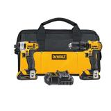 Includes: compact drill/driver, impact driver, carrying case, (2) compact batteries and charger Compact, lightweight design fits into tight areas Heavy-duty 1/2 in. ratcheting chuck provides great bit-gripping strength DCF885 1/4 in. impact driver: provides up to 2800 RPM and 1400 in. lbs. of max torque 3 LED with a 20-second delay provide visibility without shadows 1-handed loading 1/4 in. hex chuck accepts 1 in. bit tips 20-Volt, 1.5Ah lithium-ion batteries charge in as little as 30 minutes (2 batteries and charger included)