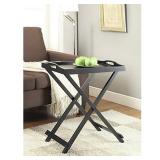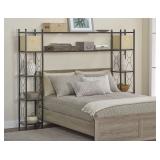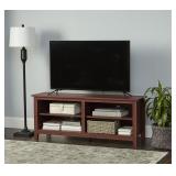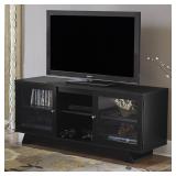 Holds up to 55" diagonal flat-screen TV Engineered wood shelves with polyvinyl chloride veneer and black powder-coated metal frame 44"W x 15-1/4"D x 20-1/3"H Assembly required