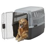 28"W x 42"D x 31"H For extra-large pets Includes plastic tray and divider panel 2 doors offer front and side access and versatile positioning Divider panel lets you customize crate interior to fit your pet Rounded corners for safety Carry handle Folds for storage Metal