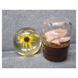 2 Glass Paperweights - Blue & White Bird of Flight - 2 3/4" H, 3" D, Yellow, White & Orange Floral Burst 2 3/4" D, 2 1/4" H |