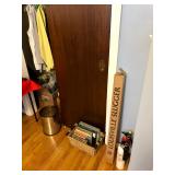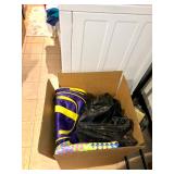 Back Porch Items Several Beach Umbrellas, Golf Putting Mat with Ball Return IOB, Boxes of Golf Balls from Titleist and Pinnacle, Outdoor Area Rug, Totes Bean Bag Toss IOB, Vintage Double Pale, Sand Toys, Patio Chairs with New Cushions, Lawn chair from Rio Adventure, Kahala Boogie Board, Staff Tour Blade, KZG and Karsten Golf Clubs, Golf Bags, Beach Accessories, Vintage Marbles in Blue Mason Jars, and SO MUCH MORE
