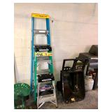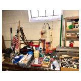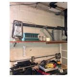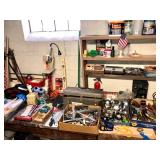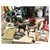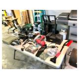 Garage Charbroil smoker, charbroil large propane grill with tank, plastic wheel barrel, three different sized Warner ladders, John Deere garden cart, workmate workbench, echo leaf blower, husky 5000 W portable generator, light bulbs, hardware, Troy bolt gas lawn mower, radial arm saw, bench face, tons of hand tools, portable heater, mailbox, ceiling fan and box, toolboxes, hedge trimmer, tree pruner, electric bench grinder, skill sander, wall sconces, plastic work Benz, yard tools, tons of chemicals, antique oil cans, antique Remington typewriter, caulking guns, large metal flower water, bird feeder, antique oil lamp, Dell OptiPlex 740 computer, levels, clamps,Vintage bow, vintage fishing poles, hose reel with hose, large tree pruner, extension cords, circular saw, electric drills, Palm Sanders, AND SO MUCH MORE