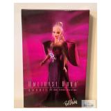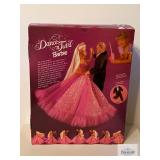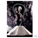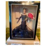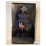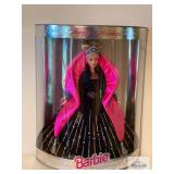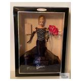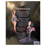 SKU #: 50722Who but Barbie® could look even better on her 40th anniversary than on her first debut? 1959 meets 1999 as Barbie® doll dons a black flock bodice shimmering with silvery glitter nostalgically reminiscent of her original 1959 striped-pattern bathing suit. Her slim silhouette gown of black organza spills to a delicate tulip hemline. An illusion neckline of sheer black and daring dangly earrings offset her soft French twist and exquisitely charming face. Adding a dynamic touch to celebrate her 40th anniversary is a bountiful bouquet of 40 pink "roses, " which she gracefully holds in her arms that are covered with sheer black opera-length gloves. A miniature replica of the original 1959 doll and package are included.