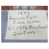 1999 American Eagle Silver Dollar, (6) 1976 Bicentennial Quarters