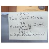 1865 2 Cent Coin, 1961 Roosevelt Dime, 1930s US Buffalo Nickel