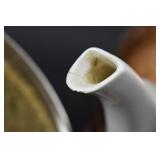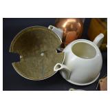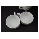 44. Silver Overlay Brown Glaze Tea Set - Lenox Teapot w/ Unicorn Mark and Crown Staffordshire England Cups w/ Saucers