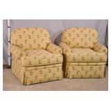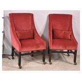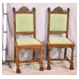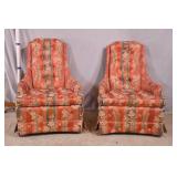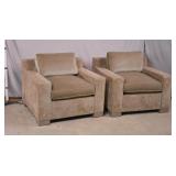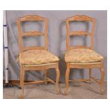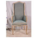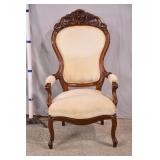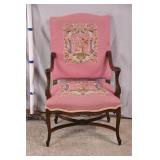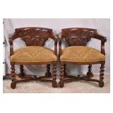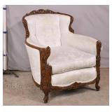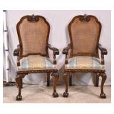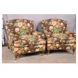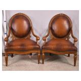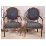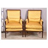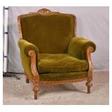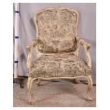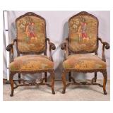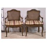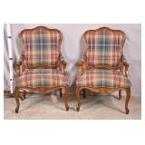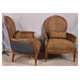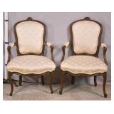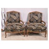Pair of carved French style open armchairs; 68-178 - (crack on one arm, repaired molding on top of both; stains on fabric) - 24x24x37