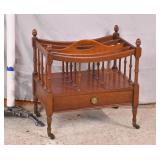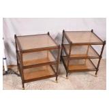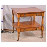 Banded yew wood 2 tier end table; 68-117 - turned legs and columns - brass toe caps and casters - 2 drawers - 24x24x23.5