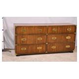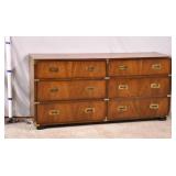 Lane walnut campaign style 6 drawer double dresser; 68-151 - brass hardware - (finish as-is) - 62x18x30.5