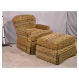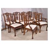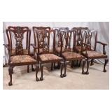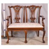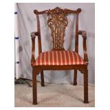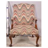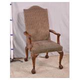 Carved mahogany Queen Anne style open armchair; 68-110 - shell carved knees - ball in claw feet - front and back - plaid fabric (stains on fabric) - 26.5x29.5x46