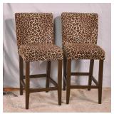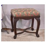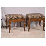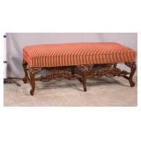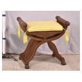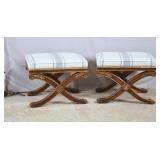 Pair of carved X base benches; 68-164 - brass nail head trim - striped fabric - 24x18x19