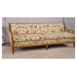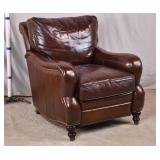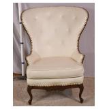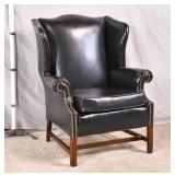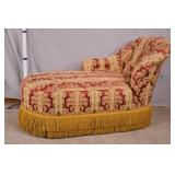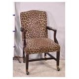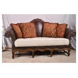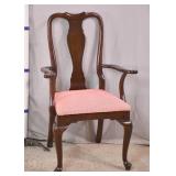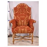 Southwood William & Mary style armchair; 705-126 - distressed legs - stretcher base - faux ostrich skin sides and back - brass nail head trim - red and gold fabric - 32.5x29x45