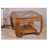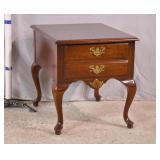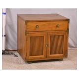 Bernhardt end table with brass accents; 1054-104 - 1 drawer over 2 doors - (small chips in veneer on back edge of right side) - 23x18x23